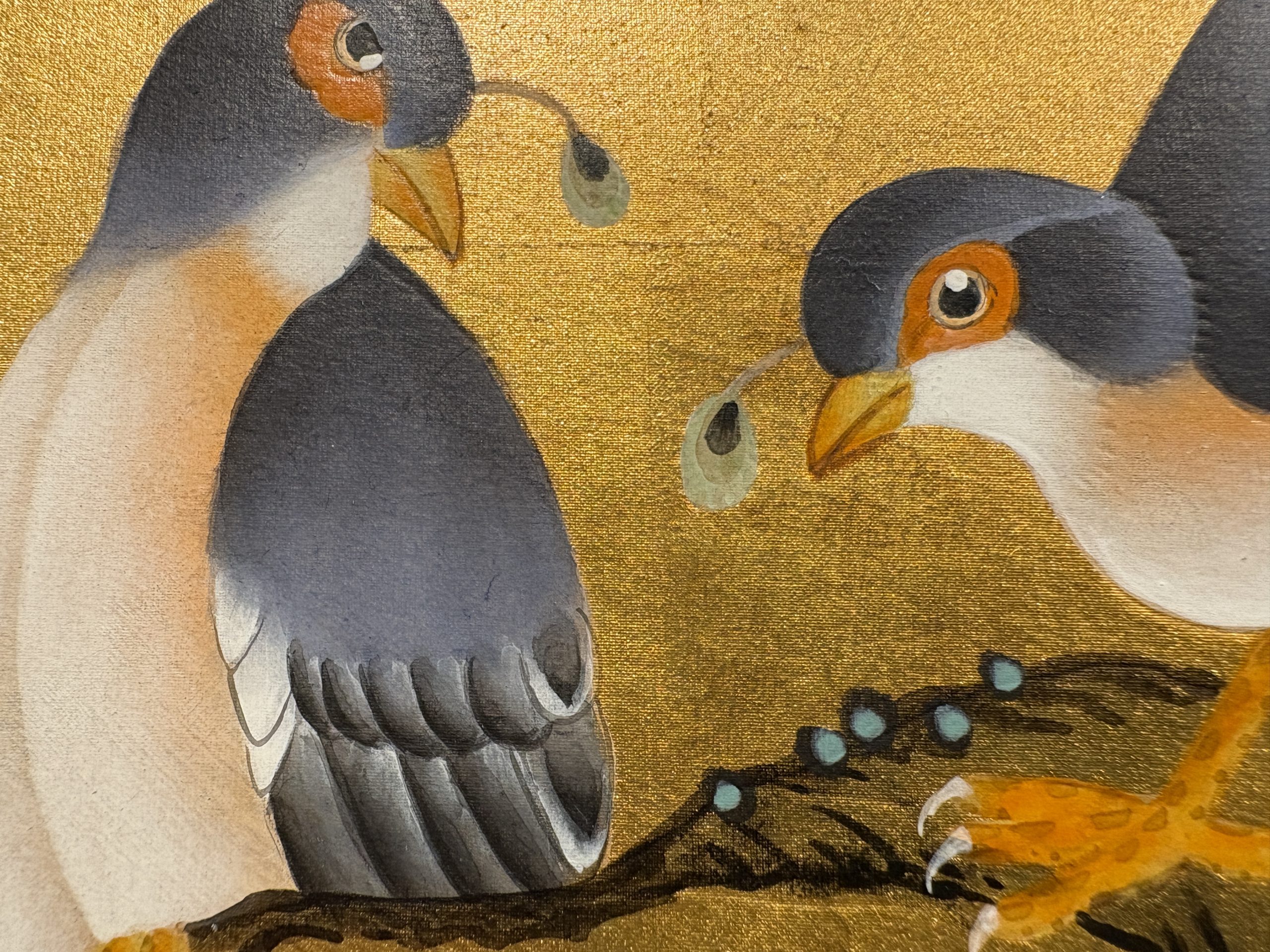 This Silkaroma artwork is created on radiant gold leaf, where the luminous surface enhances the elegance of the floral-and-bird motif. The interplay between the gold background and the hand-painted details creates a rich visual contrast—refined, graceful, and quietly striking. The gentle sheen of the gold leaf gives the composition a sense of warmth and depth, allowing the artwork to stand out without overwhelming the space.