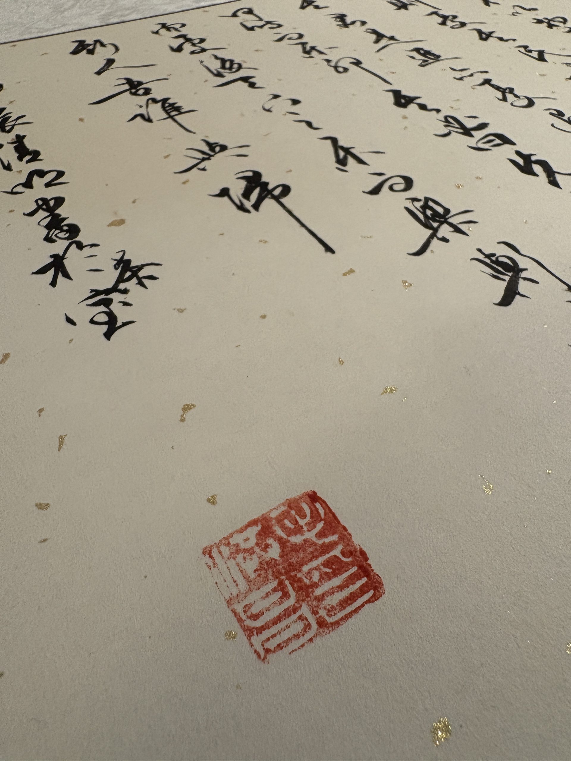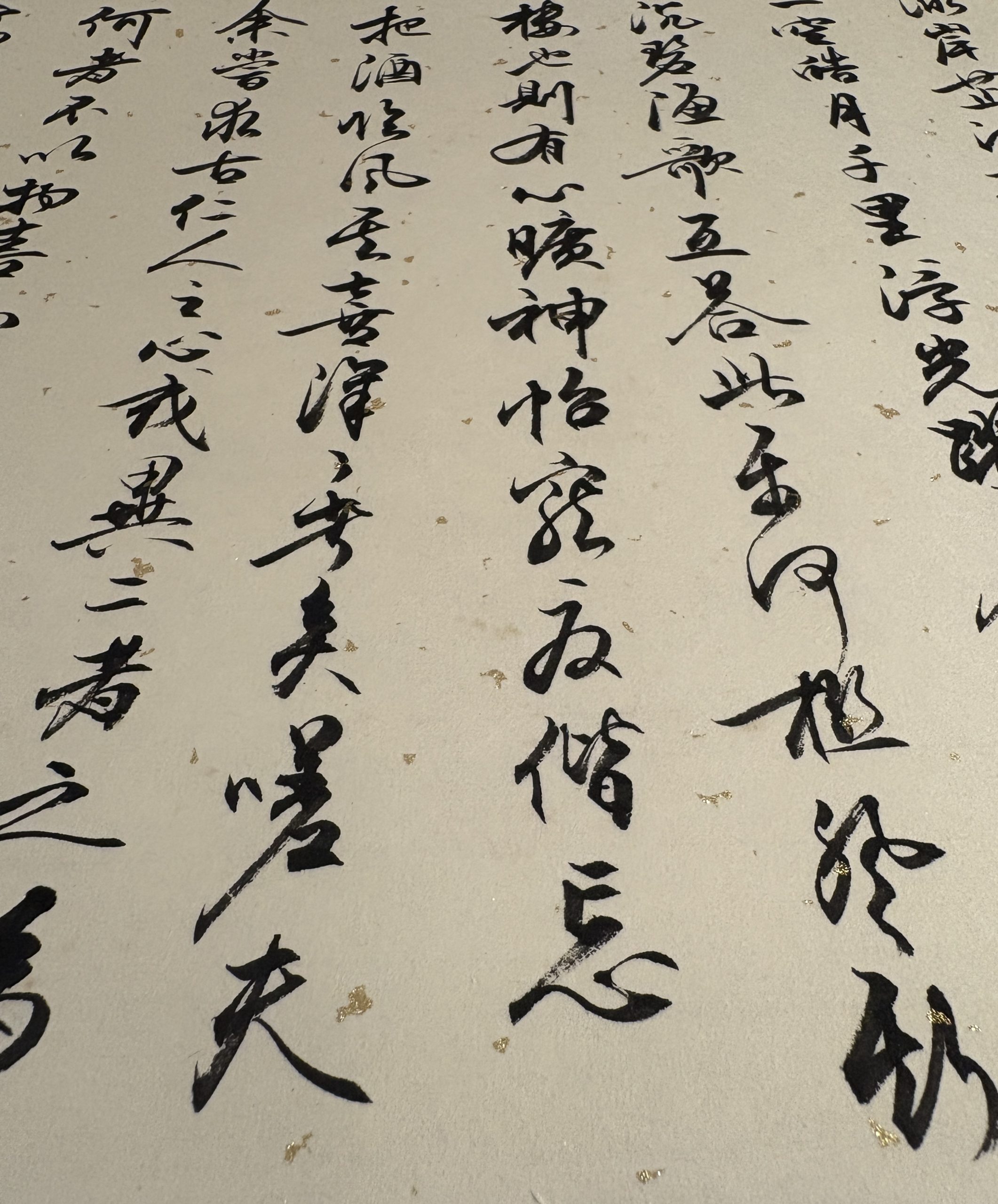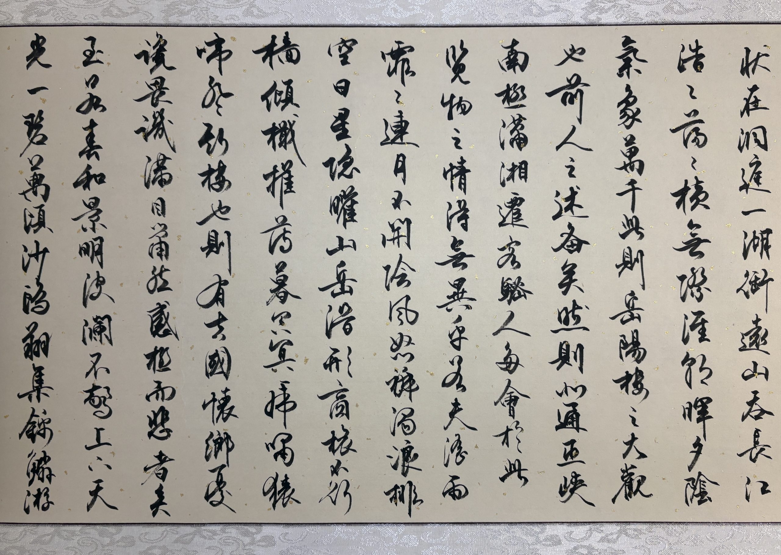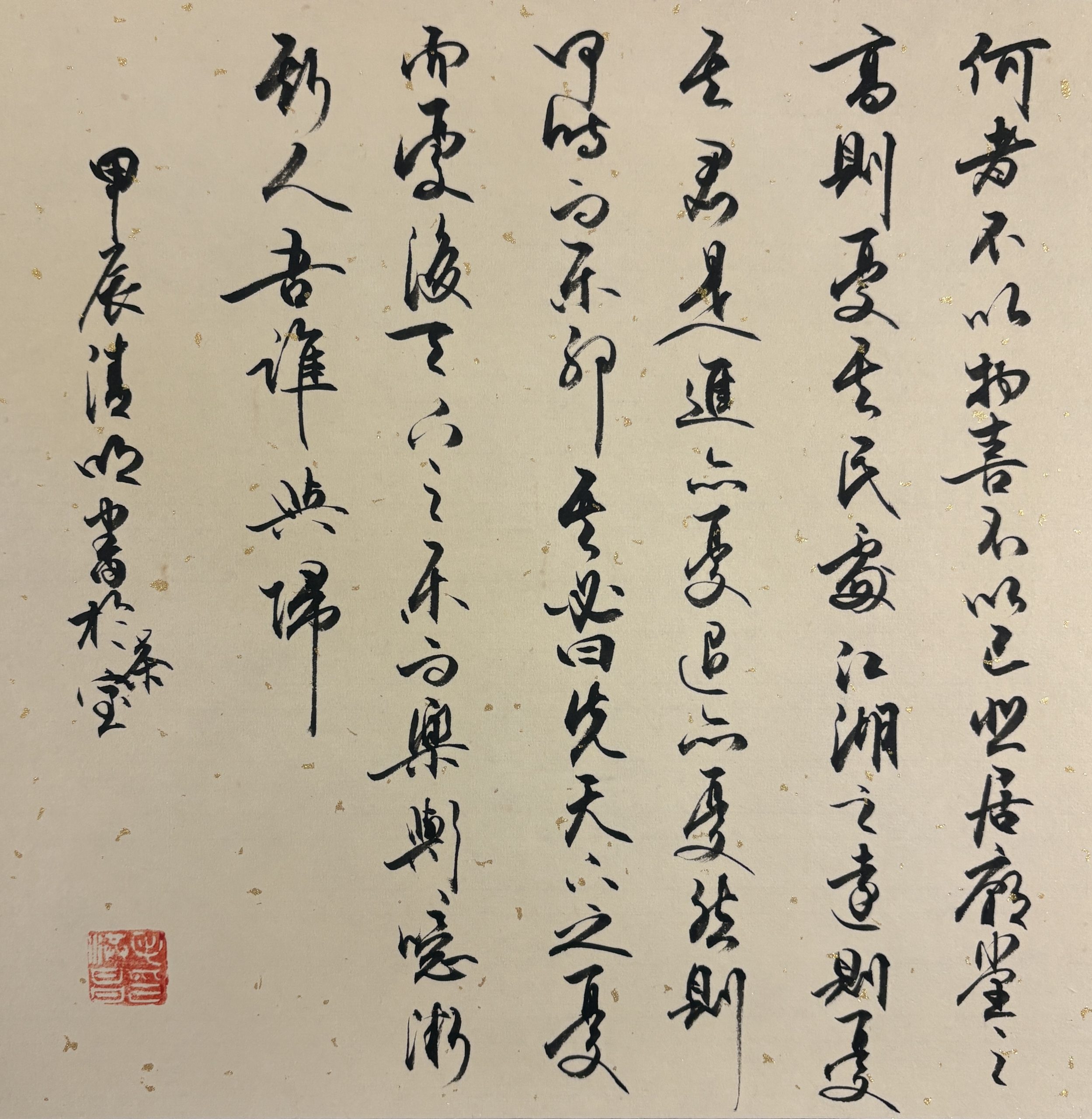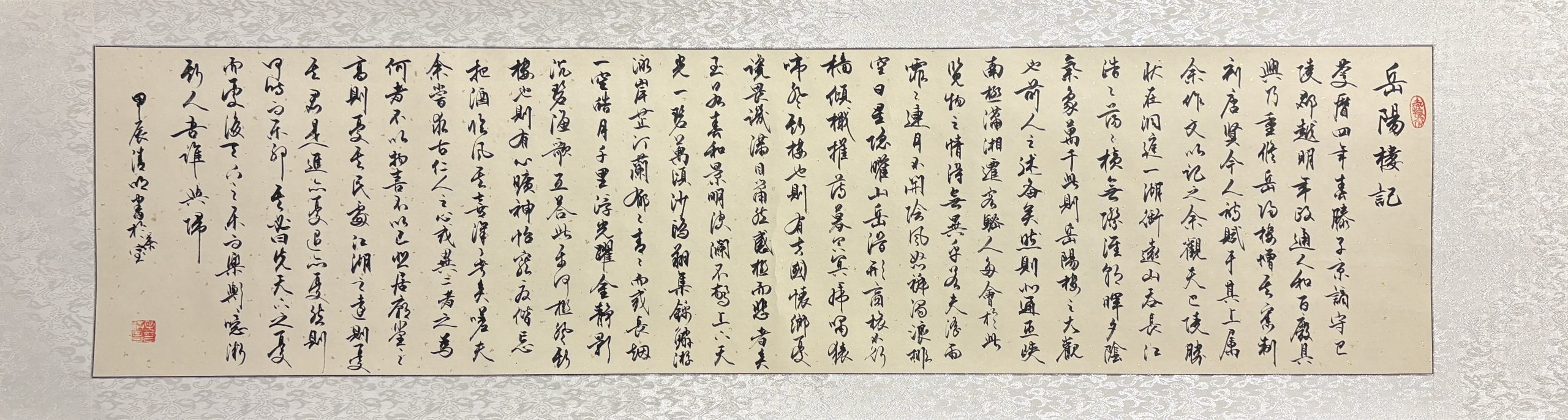 This calligraphy piece features the complete text of “Memorial to Yueyang Tower” (Yueyang Lou Ji) and was handwritten by Raymond Mao on Qingming Day, April 4th,2024. The strokes are delicate and flowing, with an open and harmonious composition. The text is taken from the classic prose by Fan Zhongyan, in which he describes the vast scenery of Dongting Lake from Yueyang Tower and expresses deep reflections on life, fortune, and devotion to the nation. The work is renowned for its closing line —“Be the first to worry about the world’s troubles, and the last to enjoy its happiness.”